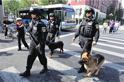 昨天上午,3名頭戴防暴頭盔,身配18.4毫米防暴槍、95式?jīng)_鋒槍和92式手槍,帶領(lǐng)兩只警犬巡邏的特警隊員現(xiàn)身臺基廠北口。昨天起,武裝特警開始帶警犬在長安街沿線、西單、王府井等重點地區(qū)巡邏。據(jù)悉,多個特警巡邏車組從早8點半到晚10點無縫隙地進行巡邏,每個車組由3名特警隊員組成,參加巡邏的還包括部分女特警隊員。警方提醒市民,由于特警攜帶的大多是撲咬犬,看到警犬后千萬不要試圖撫摸、引逗警犬。(董世彪 盧國強)