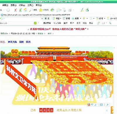 網(wǎng)友“l(fā)eining”加入方陣后說,“國慶,出個網(wǎng)民方陣也不錯,喜歡熱鬧的網(wǎng)友可以踴躍參加”!發(fā)ein-ing”還提議,以后可以多在網(wǎng)上做慶典,網(wǎng)慶的最大好處是簡約、文明、時尚。有網(wǎng)友就說:“我想?yún)⑴c其中,唱著歌,踏著正步,注視著天安門,熱淚盈眶,祖國萬歲!”