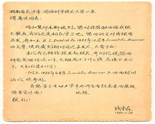 隨后,譚暑生每當在學術研究過程中有什么新的進展,或者遇到什么困惑,他都會寫信給錢學森,而錢學森基本上也會每信必回。為了讓譚暑生能潛心于科學研究工作,錢學森還多次給國防科大領導寫信,說“譚暑生的研究室做理論工作,大概花不了什么錢,應該下決心干!