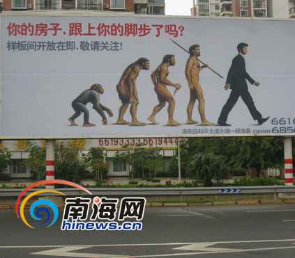 (海南)海口海甸島某樓盤廣告內(nèi)容與人類進(jìn)化掛鉤,看到該廣告的市民都覺得受了莫大的侮辱,認(rèn)為該廣告有辱公民道德風(fēng)尚,要求相關(guān)部門依法取締并查處。然而記者進(jìn)一步調(diào)查發(fā)現(xiàn),該廣告已通過工商部門審批,核發(fā)了許可證,網(wǎng)友直指該廣告低俗。