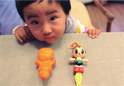 據楊女士介紹,上周末,她帶著2歲的女兒家奕到農村去采摘,“孩子牙還沒長齊,正好喂軟柿子吃”。在柿農為其采摘時,家奕在一旁往樹上看,“她用手指著,嘴里嘟囔著什么。”這個柿子被摘下來,柿農說它像人參果,就把它送給了家奕。“回來的路上,家奕就一直在玩那個柿子,嘴里還是嘟囔著。”回到家,家奕拿出“鐵臂阿童木”的玩偶,楊女士才知道,原來,家奕一直在說那個柿子像“阿童木”。楊女士說,“這個‘柿子阿童木’都已經軟了,但是,如果放進冰箱凍起來,家奕玩不到就會哭的。” (實習記者李川)