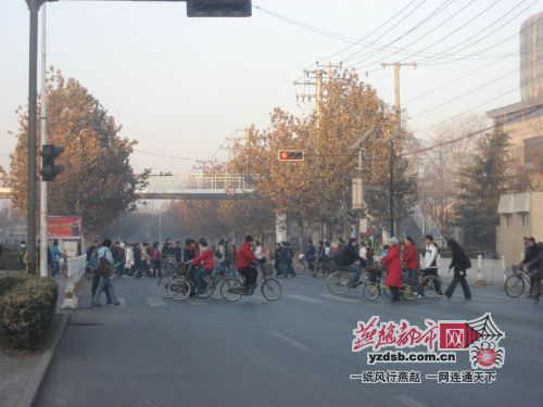 就在兩校區門口,赫然立著一個大牌子“請走過街天橋”,來往的人們卻熟視無睹。對于為何不走天橋,讀大二的蘇同學表示,“橫穿馬路直線距離才20米左右,過天橋至少要走80多米,太繞了。”也有同學表示,有紅綠燈和斑馬線,不走天橋也很安全。一名男生則指著天橋向記者解釋:“不是我們學生素質低,天橋沒有設計自行車道,我們天天騎自行車沒辦法過天橋。”