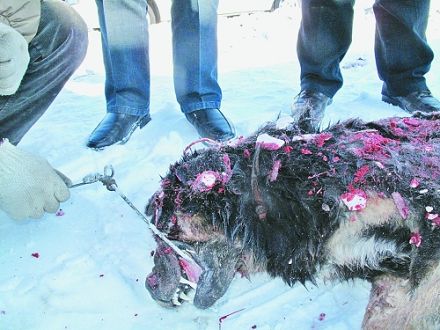 只見,父親的脖子和臉上血肉模糊,全是鮮血。脖子處,喉嚨和皮肉都沒有了,只剩下一根骨頭連著身體和腦袋;頭部、臉上已無皮肉,兩個眼珠和耳朵也不見了蹤影,頭發下面只剩一顆血淋淋的骷髏,下面白色的積雪早已被鮮血染紅,已經與頭顱凍結到了一起。此時,父親張明的身體已經僵硬。