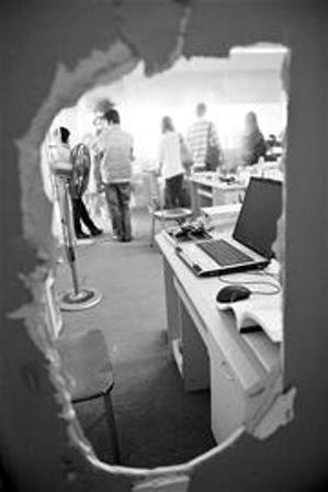 頂開卷閘門后,放著大廳里5臺可以輕松搬走的電腦不要,這伙小偷偏愛玩個“難度”,大費周章地在上鎖的辦公室墻上“打洞”,然后把鎖在辦公室里的電腦搬走。