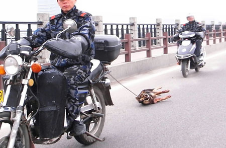 摩托車后系著一條鐵鏈,拖著一只血肉模糊的狗飛奔。昨天,一組被標著“慘無人道”標題的照片在福州各大論壇瘋傳,甚至被稱為福州版的虐狗門。拍下這些照片的網(wǎng)友表示,在春節(jié)期間看到如此一幕非常難受,而有網(wǎng)友認為這可能是有人在偷狗。
