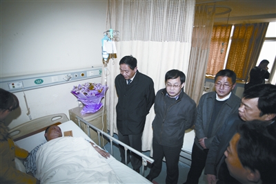 大年初二,在連續工作近一個月后,37歲的江漢區城管執法大隊直屬六中隊隊員劉漢橋突發腦溢血。昨日(21日)下午,江漢區委書記張平、區長李強來到協和醫院,看望了劉漢橋及妻子,并送去鮮花、慰問金和營養品。
