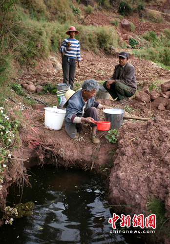 “1月18日,寨子里的井就徹底干了,200多人的飲用水告急。第二天,村民們在那塊低洼地挖了一個長1米左右,寬40公分的水洼,勉強能夠在那打水。”起榮峰不停地給記者比劃當時的情況。之后,上灣村寨的村民就靠這一個小水洼暫時解決了生活用水。村民張春富說:“那點水根本不夠我們吃,每一家都是隔天挑水,而且還得分上午、下午輪著挑,那里還有水分來澆地的莊稼哦!
