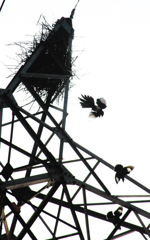 附近的居民武先生告訴記者,就在半個月前,他散步路過這座高壓電線架下,忽然有一根細(xì)樹枝從空中掉了下來,隨之聽到上面?zhèn)鱽硪魂囮噽偠镍B叫聲。抬頭一看,發(fā)現(xiàn)是兩只喜鵲銜著樹枝站在電線架頂部的鋼架上,像是在討論什么似的——估計這是一對夫妻,它們開始搭窩了。