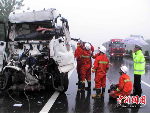 到達現(xiàn)場后,只見地上滿是兩車撞擊后散落的碎片,一輛車牌號為陜AA5477的貨車車尾已變形,車牌號為贛AA1398的追尾石油貨車車頭嚴(yán)重變形,車內(nèi)司機雙腿被方向盤卡住無法動彈,且受傷嚴(yán)重,生命垂危。另有一名婦女被困在后排座位,由于事發(fā)時婦女正平躺在后座睡覺,所以只被前排座位擠壓,尚有活動空間,并無危險。