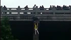 實拍男子十米高橋護欄外單手拉住跳橋女子