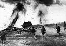 戰爭初期,蘇軍積極防御。1941年10月─1942年1月,蘇軍殲敵50多萬,取得了莫斯科會戰的勝利,使希特勒“閃電戰”慘遭失敗。1942年11月19日,蘇軍展開反攻,次年,迫使希特勒轉入戰略防御。