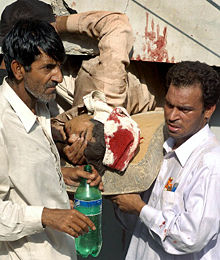 圖:巴基斯坦救援人員救助受傷人員(10月10日 09:17)