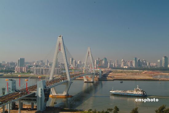 世紀(jì)大橋既是海南省重點(diǎn)建設(shè)項(xiàng)目,也是海口市標(biāo)志性建筑物,由海口市路橋建設(shè)管理公司負(fù)責(zé)建設(shè)。大橋全長2663.606米,其中主橋長636.60米,主橋?yàn)殡p塔雙索面三跨(147+340+147)連續(xù)預(yù)應(yīng)力混凝土邊主梁斜拉橋,橋面寬29.8米,兩側(cè)設(shè)人行道。主塔呈鉆石型,塔高106.9米,主塔基礎(chǔ)為圓端型沉井,上口面積29.8米×18.6米,下口面積30.4米×19.2米,深40.1米,斜拉索每一單面22根,共176根。引橋?yàn)轭A(yù)應(yīng)力混凝土連續(xù)箱梁,基礎(chǔ)采用預(yù)應(yīng)力高強(qiáng)度混凝土管樁。南引橋長1101.094米,連接段233.867米;北引橋長524.45米,北引道167.595米,引橋?qū)?4.3米,兩側(cè)不設(shè)人行道。橋面為雙向6車道,設(shè)計(jì)行車速度為60公里/小時(shí)。主跨下最高水位4米時(shí)通航凈高為24米。主橋兩端共設(shè)4座塔樓,南北岸設(shè)橋頭廣場。
