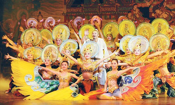 《絲路花雨》是以舉世聞名的絲綢之路和敦煌壁畫為素材創(chuàng)作的大型民族舞劇。它歌頌了畫工神筆張和歌伎英娘的光輝藝術(shù)形象,描寫了他們的悲歡離合以及與波斯商人伊努斯之間的純潔友誼。《絲路花雨》自1979年首演至今,共演出1400余場,觀眾達300多萬人次,2004年10月被上海大世界基尼斯總部認定為“中國舞劇之最”。多年來,《絲路花雨》先后訪問過朝鮮、法國、意大利、日本、泰國、前蘇聯(lián)、西班牙、土耳其及港澳臺等20多個國家和地區(qū),演出深受好評,被譽為“中國民族舞劇的典范”。
