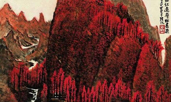 《萬山紅遍層林盡染》是根據毛澤東詩詞《沁園春·長沙》所作。李可染喜讀毛主席詩詞,并從那激越豪邁的詩里領略山水畫的境界。此畫是據“萬山紅遍,層林盡染”句意再造了一個藝術世界,在黑紅對比中寫南國深秋景色,帶有理想化的詩意色彩。