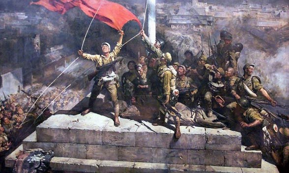 《占領總統府》表現的是中國人民解放軍占領南京總統府,升上紅旗的場面,標志著蔣家王朝的滅亡,新中國的開始。作品場面壯觀,氣勢恢弘。畫家用現實主義的創作方法使這一歷史題材的創作具有紀念碑的意義。