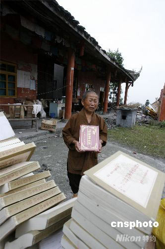 ·圖:尼姑從垮塌的大殿中搶救出的經書(6月5日 09:36)