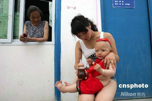 ·都江堰災民安置點簡易房前的祖孫三代(6月6日 14:42)