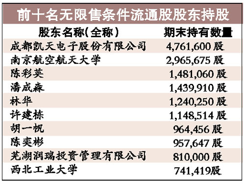 而從三季報看出,在成飛集成大漲的同時,不少投資者斥巨資進入。在十大股東中,除了成都凱天電子、南京航空航天大學,以及西北工業大學外,新進入了7大股東,累計增持的804.2萬股,其中陳彩英、潘成淼、林華等5人為自然人持股,蕪湖潤瑞投資也以81萬股,成為第九大股東。沈文軍、張雪娟等已經被踢出前十大流通股東。有市場分析師認為,無論這5位自然人是什么來頭,都不愧為今年的最牛散戶。(張忠安)