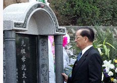 墓園青青,香煙裊裊。供案上紅燭高燒,素果芬芳、祭酒清冽。墓碑后的墳冢旁敬獻著兩個大花圈,其中一個是連戰夫婦攜子女敬獻的。九時三十分,在秦腔曲牌《柳青娘》及《苦壽庵》哀婉樂聲中,一家人在沈太夫人墓前上香、一拜、獻花、獻酒、獻果,并誦讀祭文。國民黨訪問團團員也祭拜了沈太夫人。 。....<全文>