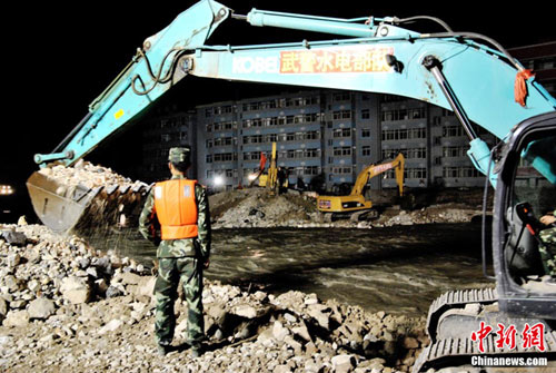為盡快消除舟曲特大泥石流形成的白龍江堰塞體,疏通河道,早日解除舟曲縣城水患,武警水電部隊(duì)官兵日夜艱苦奮戰(zhàn)在在1.5公里的白龍江兩岸搶險(xiǎn)一線, 24小時(shí)晝夜挖掘和清理河道中的碎石淤泥,到目前水位下降已3米多 縣城淹沒房屋逐退水面。白龍江堰塞體搶險(xiǎn)工作已全面進(jìn)入沖刺階段,圖為8月26日晚11時(shí)左右武警水電部隊(duì)官兵夜戰(zhàn)白龍江的施工現(xiàn)場。中新社記者 侯志紅 攝