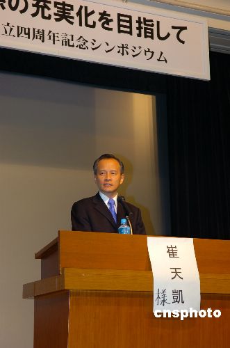 11月2日下午,日本華人教授協會在東京朝日禮堂舉行創建四周年研討會,中國駐日使館崔天凱大使出席并發表基調演講,來自日本政界、商界、學術界、中國駐日使館以及當地媒體相關人士近400人參加。此次研討會的主題為“進一步充實中日戰略互惠關系”。與會專家從政治外交、經濟金融、科學技術和文化教育領域就研討會的主題進行了探討。在基調演講中,崔天凱大使就當前中日關系的發展提出幾點意見。中新社發 滕劍峰 攝