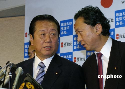 民主黨代表小澤一郎與黨干事長鳩山由紀夫(右)商討回答記者提問。