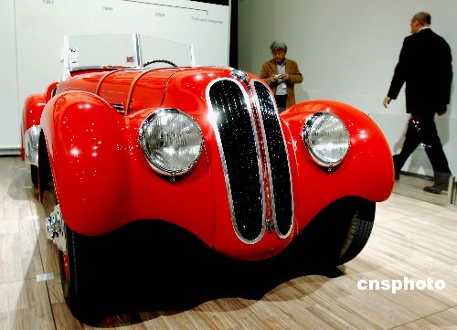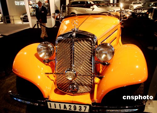 在洛杉磯舉辦的二00七北美國際車展上,一輛奔馳和一輛寶馬老爺車向參觀者述說著百年汽車文化傳承至今的變遷歷史。中新社發 賈國榮 攝
