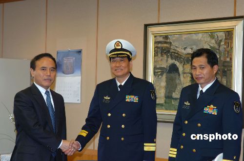 11月29日上午,正在日本進行正式友好訪問的中國海軍軍艦訪日團指揮員肖新年少將一行來到日本防務省,與日本軍界進行交流活動。圖為肖新年少將(中)與日本防務省遷優參事官(左)握手,訪日中國海軍導彈驅逐艦“深圳號”艦長朱建達上校(右)陪同會見。中新社發 滕劍峰 攝