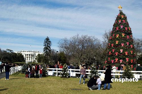 當地時間12月24日,在圣誕節平安夜前,白宮門前巨大的圣誕樹吸引了眾多前來參觀的游人。一九二三年平安夜起,白宮前第一夫人格蕾絲就倡導在白宮門前每年插上圣誕樹,并命名為“國家圣誕樹”,到一九七三年,當時的白宮主人為了保護森林,下令停止每年砍伐樹木做圣誕樹,叫人種植了一棵巨大的圣誕樹,美國五十個州還送來小圣誕樹樹種在周圍,以便游人觀賞。中新社發 邱江波 攝