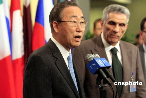聯合國秘書長潘基文(左)二十七日發(fā)表聲明,對巴基斯坦前總理、人民黨領袖貝·布托遇刺表示“震驚和憤怒”。他呼吁巴人民在此“困難時期”保持冷靜和克制,為和平和民族團結共同努力。中新社發(fā) 李靜 攝