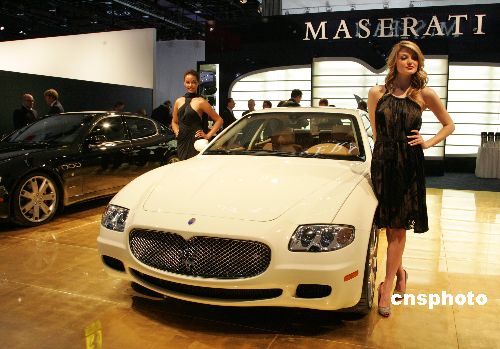 底特律當(dāng)?shù)貢r(shí)間一月十三日,在2008年北美國(guó)際汽車(chē)展上,瑪莎拉蒂豪華房車(chē)與時(shí)尚美女華麗現(xiàn)身。中新社發(fā) 潘索菲 攝