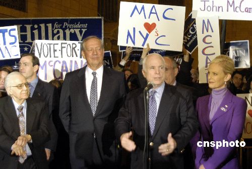 美國共和黨總統參選人、亞利桑那州的聯邦參議員麥凱恩(右三)四日在紐約中央火車站與支持者和記者見面,為五日美國二十余州進行的二00八年大選初選作最后沖刺。希拉里的支持者也來到現場,進行“選前對抗”。中新社發 李靜 攝