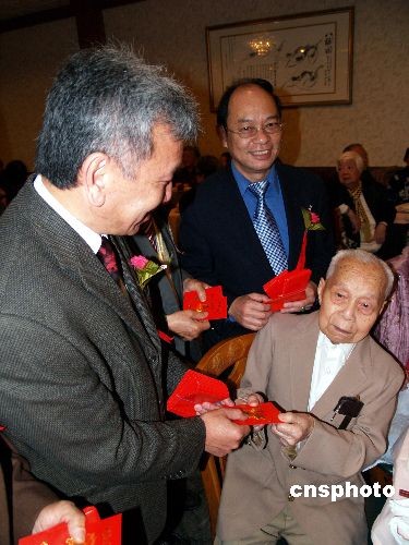 圖為中華會館主席伍競?cè)旱葍S領(lǐng)特向101歲的老人周榮福發(fā)紅包。