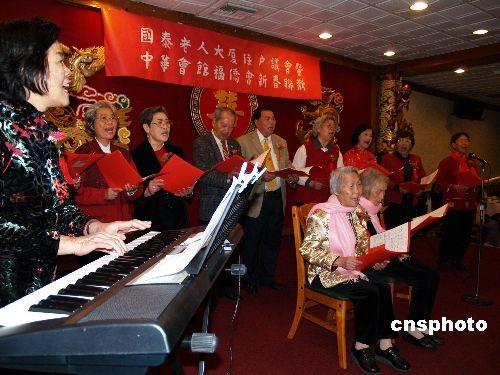 2月14日,適逢情人節(jié),美國洛杉機(jī)中國城國泰老人大廈300多位華人耆老歡聚聯(lián)歡,這些年均年齡80歲的老人們現(xiàn)場唱起了“青春之歌”。中新社發(fā) 盧威 攝