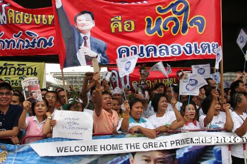 當地時間2月28日上午9點45分,泰國前總理他信結束了17個月的流亡生活,飛抵曼谷素萬那普國際機場。成千上萬的泰國民眾一大早就聚集在機場,熱烈歡迎他信回國。中新社發 顧時宏 攝
