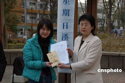 3月9日,日本東京漢語角舉行的第30次交流會上,日本僑報社社長張景子(右)代表中日兩國的捐款者,把全部捐款和寫給湖南省長周強的信,轉交給了正在日本訪問的湖南省人民對外友好協會干部曾卓然(左),表達大家對湖南災區人民的關切之情。近一個月來,日本僑報社組織的為湖南災區人民捐款活動,共收到4個團體、53位日本友人和在日華人的全部捐款38.2885萬日元。中新社發 段躍中 攝