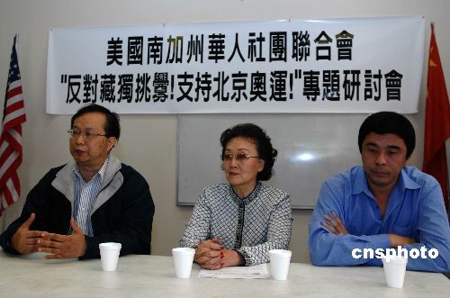 當地時間4月2日,美國南加州華人社團聯合會舉行“反對藏獨挑釁、支持北京奧運”座談會。美國南加州華人社團聯合會主席張素久(中)和美國北京聯合會會長燕青(右)等發言譴責拉薩‘三·一四’打砸搶燒暴力事件。旅美資深評論員鄭浪平(左一)特別贊揚中國愛國青年自發反擊某些西方媒體歪曲報道的行動。中新社發 張煒 攝