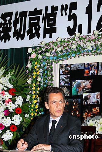 巴黎時間五月十九日下午,法國總統薩科奇來到中國駐法國大使館,對中國四川汶川地震遇難者表示深切哀悼。圖為薩科奇在留言簿上留言。中新社發(fā) 吳衛(wèi)中 攝