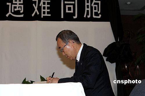 5月19日,聯(lián)合國秘書長潘基文來到中國常駐聯(lián)合國代表團(tuán),向四川大地震遇難者表示哀悼。潘基文在吊唁簿上用中文寫道:哀悼罹難的中國人民。中新社發(fā) 譚宏偉 攝