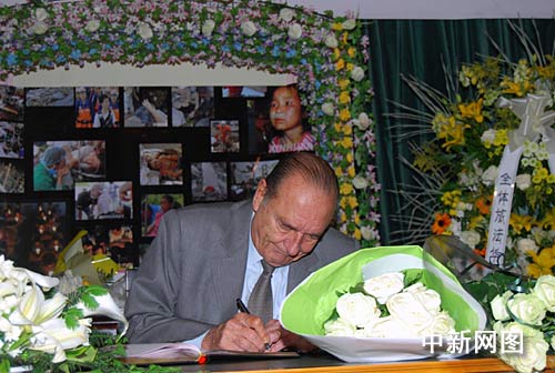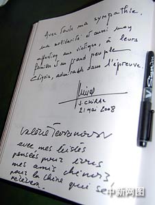 巴黎時間二十一日上午,法國前總統希拉克專程來到中國駐法國大使館,向中國汶川地震的遇難者表示深切哀悼。希拉克在吊唁簿上寫道:“對中國遇難者及他們的家屬表示深切的哀悼和慰問,對偉大的中國人民在此次抗震救災中的表現表示欽佩。” 作者:吳衛中