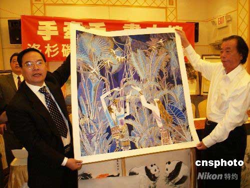 5月27日,著名旅美云南重彩畫(huà)家丁紹光捐出自己6幅畫(huà)作,參加洛杉磯66位畫(huà)家及書(shū)法家“手牽手、畫(huà)中情”共同為四川大地震捐畫(huà)賑災(zāi)義賣(mài)活動(dòng)。當(dāng)天,丁紹光的5幅云南重彩畫(huà)即被高價(jià)拍賣(mài),這次義賣(mài)所有款項(xiàng)將交中領(lǐng)館轉(zhuǎn)四川災(zāi)區(qū)。圖為丁紹光(右)展示義賣(mài)畫(huà)作,左為南加州華人團(tuán)體聯(lián)合總會(huì)會(huì)長(zhǎng)程遠(yuǎn)。中新社發(fā) 盧威 攝