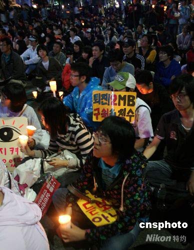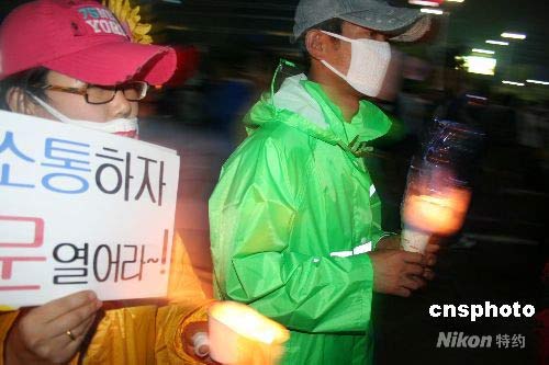 韓國民眾6月6日在在首爾市中心舉行了反對進(jìn)口美國牛肉的燭光集會,警方和主辦方推算的集會群眾達(dá)到5.6萬和20萬,是燭光集會開始以來規(guī)模最大的一次。中新社發(fā) vivi 攝
