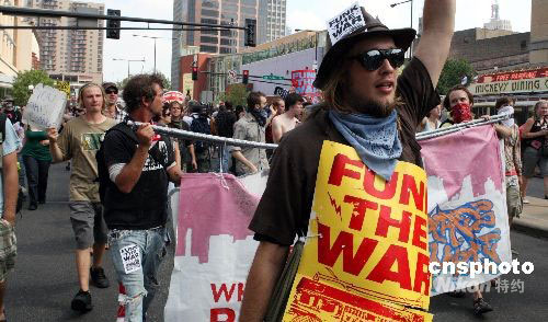 來自全美各地的數(shù)千名反戰(zhàn)人士一日在位于明尼蘇達(dá)州首府圣保羅的共和黨全國代表大會會場外示威,反對即將獲得共和黨總統(tǒng)候選人提名的亞利桑那州國會參議員麥凱恩支持布什政府的伊拉克政策。中新社發(fā) 李靜 攝