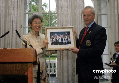 當地時間17日晚,中國駐英使館在倫敦文華東方酒店舉辦招待會,慶祝北京奧運會和殘奧會的閉幕。圖為中國駐英大使傅瑩(左)向英國奧委會首席執行官西蒙·克萊格贈送英國隊進入鳥巢體育場時的照片。 中新社發 李鵬 攝