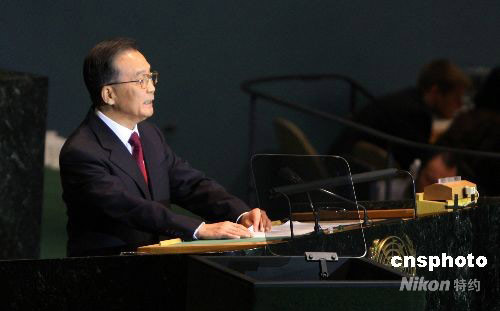 圖:溫家寶在千年發(fā)展目標(biāo)高級別會議上發(fā)表演講
