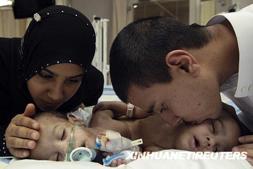 在沙特阿拉伯首都利雅得的一家醫(yī)院,伊拉克連體男嬰齊亞德和伊亞德的父母在親吻熟睡中的孩子。這對四個(gè)月大的連體男嬰將于25日迎來分離手術(shù)。新華社/路透