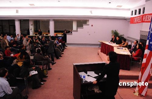 當地時間十月二十八日晚,兩黨競選陣營代表在此間和美籍華人社區領袖舉行特別會議,就兩黨的競選政策回答了華裔選民關注的問題。圖為民主共和兩黨競選陣營代表和華裔選民交流。中新社發 邱江波 攝