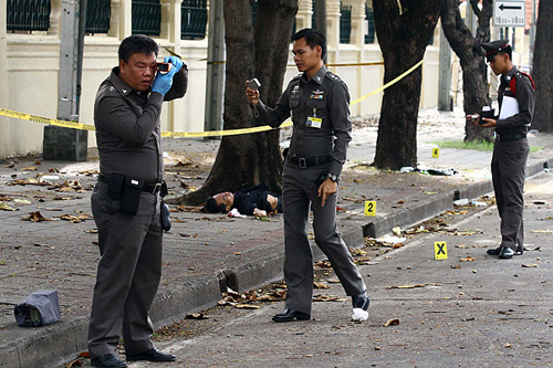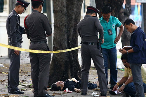 10月30日,在泰國(guó)首都曼谷,泰警方在檢查一名男子的尸體。當(dāng)日,泰國(guó)反政府的人民民主聯(lián)盟(民盟)設(shè)在曼谷馬卡萬橋的集會(huì)點(diǎn)發(fā)生爆炸事件,之后總理府附近又發(fā)生槍擊事件,至少造成1人死亡、10人受傷。