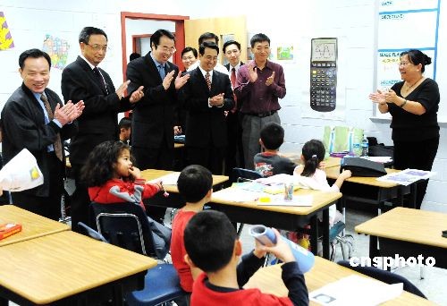 近日,國僑辦副主任許又聲在中國駐美大使館公使劉光源陪同下參觀華盛頓希望中文學校西城校區,為正在上音樂課的小朋友鼓掌。中新社發 邱江波 攝